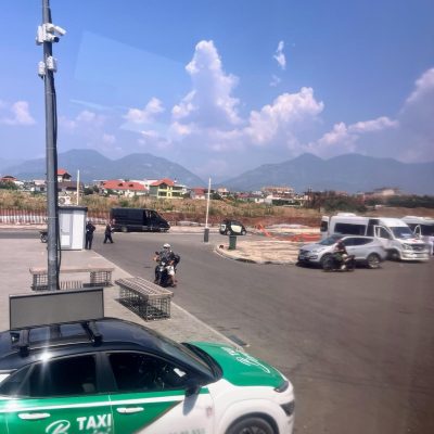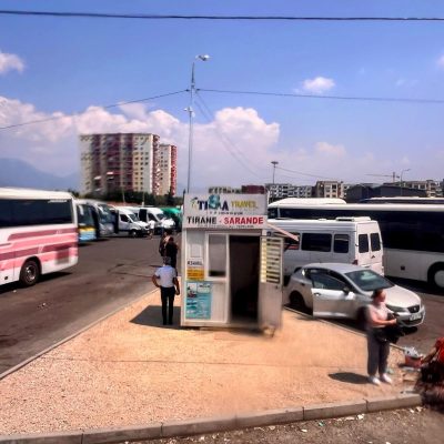 Foi uma experiência pouco agradável, especialmente porque não existe uma rodoviária estruturada: os ônibus param onde conseguem, e os passageiros circulam entre poeira, sol, ônibus e vans. Não recomendaria esse trajeto para famílias. Outro ponto negativo é que o ônibus não tinha banheiro, e na rodoviária improvisada também não. O ar-condicionado mal funcionava. No fim, nos apertamos ali para encarar uma viagem de 4 a 5 horas até Saranda.