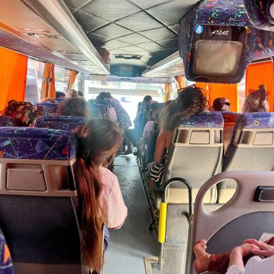 Entramos no ônibus com as malas e encontramos espaço para acomodá-las. O veículo tinha ar-condicionado, que é imprescindível já nessa época do ano, junho, quando fomos.