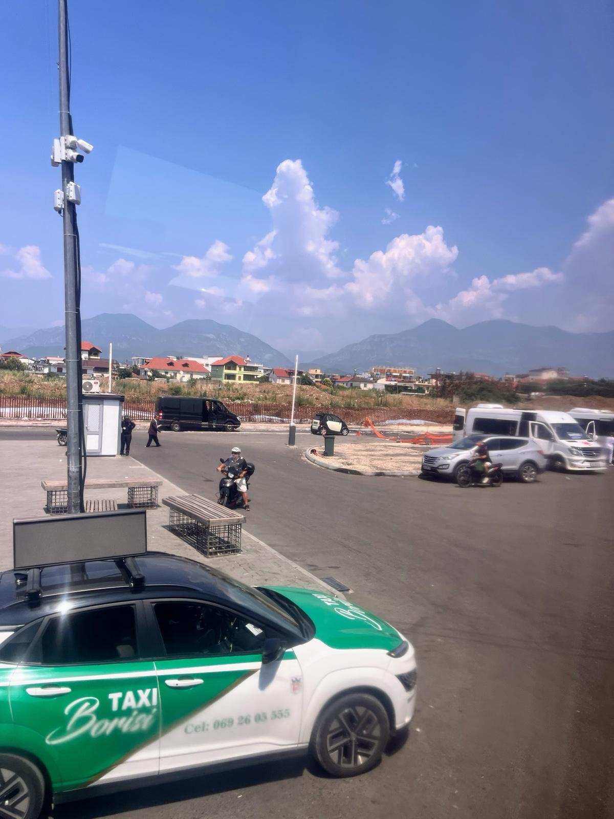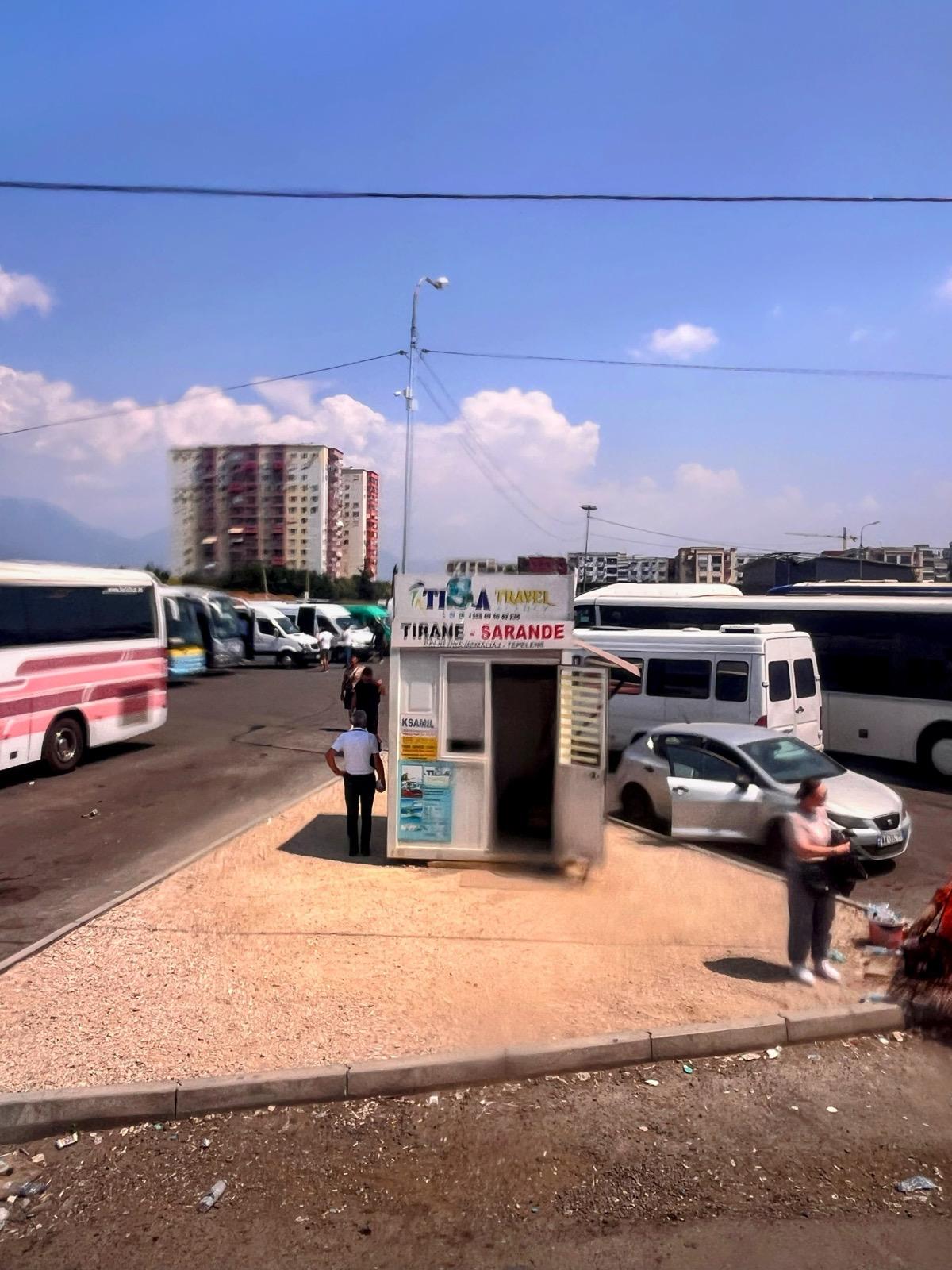 Foi uma experiência pouco agradável, especialmente porque não existe uma rodoviária estruturada: os ônibus param onde conseguem, e os passageiros circulam entre poeira, sol, ônibus e vans. Não recomendaria esse trajeto para famílias. Outro ponto negativo é que o ônibus não tinha banheiro, e na rodoviária improvisada também não. O ar-condicionado mal funcionava. No fim, nos apertamos ali para encarar uma viagem de 4 a 5 horas até Saranda.