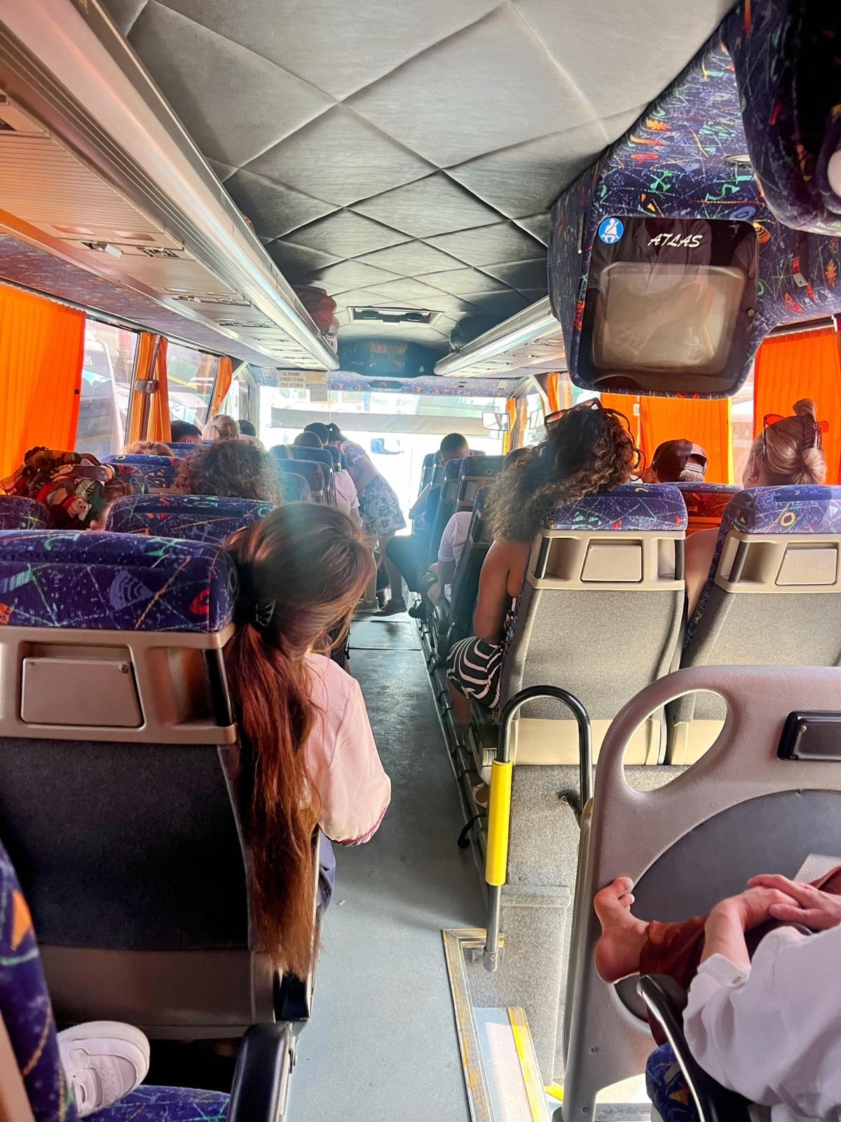 Entramos no ônibus com as malas e encontramos espaço para acomodá-las. O veículo tinha ar-condicionado, que é imprescindível já nessa época do ano, junho, quando fomos.